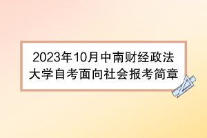 2023年10月 中南财经政法大学自考面 向社会报考简章已于近日公布了!中南财经政法大学自考每年有两次报考机会,考生可以根据自己的计划选择科目进行报考,具体报考时间和要求如下: 高等教育自学考试是我国......