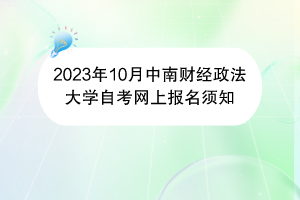 2023年10月 中南财经政法大学自考 网上报名须知已发布!每年的自考都为考生提供了两次报名的机会。上半年报名机会已经结束,如果考生错过十月的报名,就只能等明年咯!一起来看看吧! 湖北省2023年10......